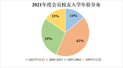 数据显示,我会2021年度会员入学年份阶层呈梯度分布,以95~10校友为主(占比约70%),年轻校友会员(10后)与95年以前的占比相对较少。近年来我会也在逐步加强与年轻校友的联络(如在京举办的“职业沙龙”),并注重区分不同年龄阶层的校友需求,相信会吸引更多的优秀校友加入。