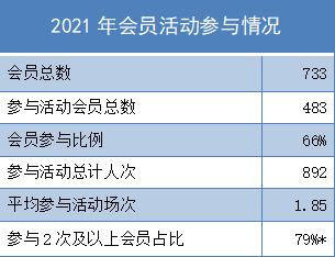 在2021全年举办的活动中,参与活动的会员共有483位(占总会员数66%),共计892人次,平均每位会员参与活动1.85场次,其中参与不止一次活动的会员占79%。