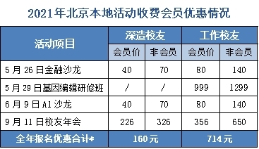考虑到疫情防控等要求,我会近年举办的线下活动严格控制场次规模。在同等情况下,我会举办活动将优先对会员校友开放并定向通知,且给予报名费会员价。下表为会员校友与非会员校友参与活动时的权益对比(以2021年科大北京校友年会活动为例):