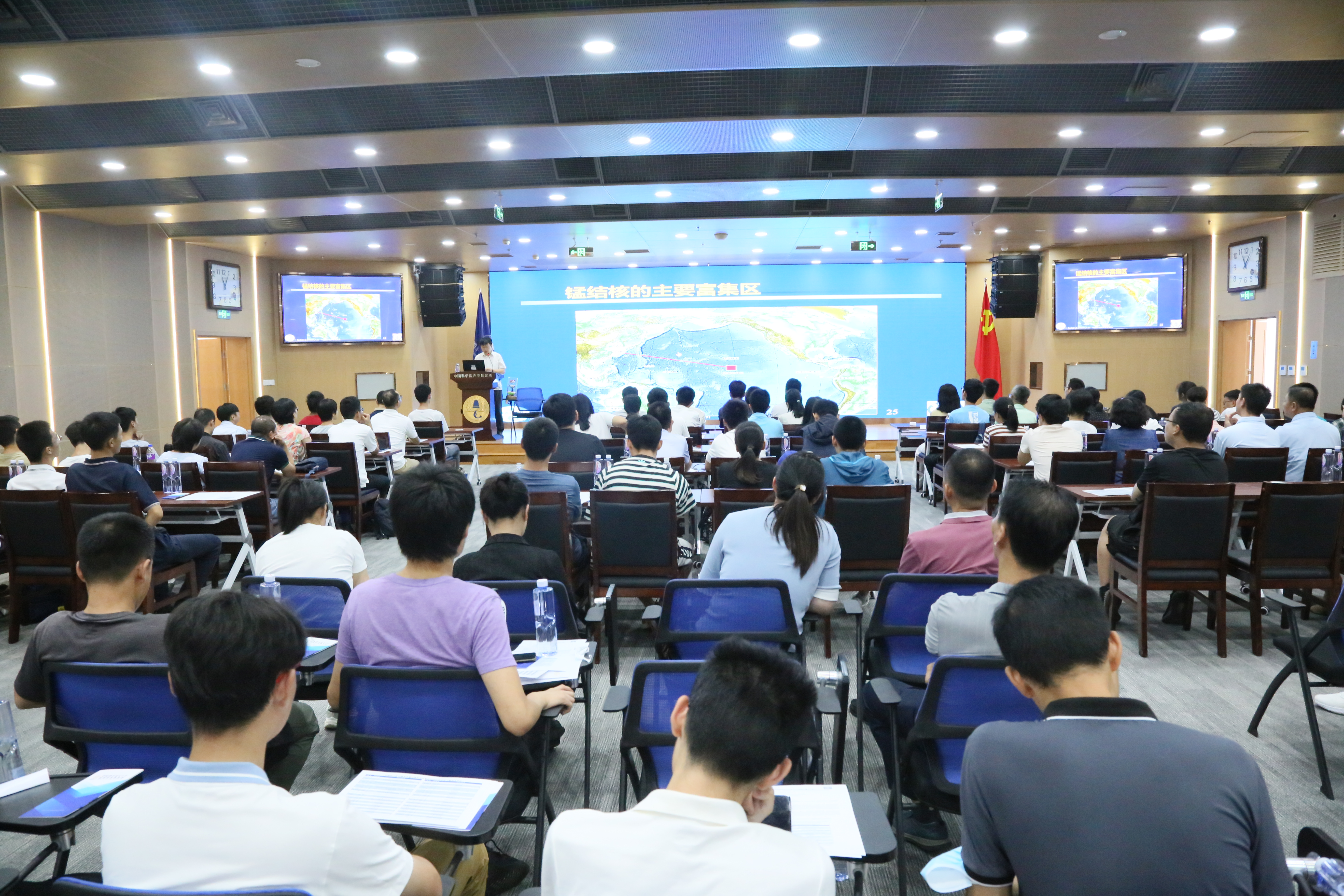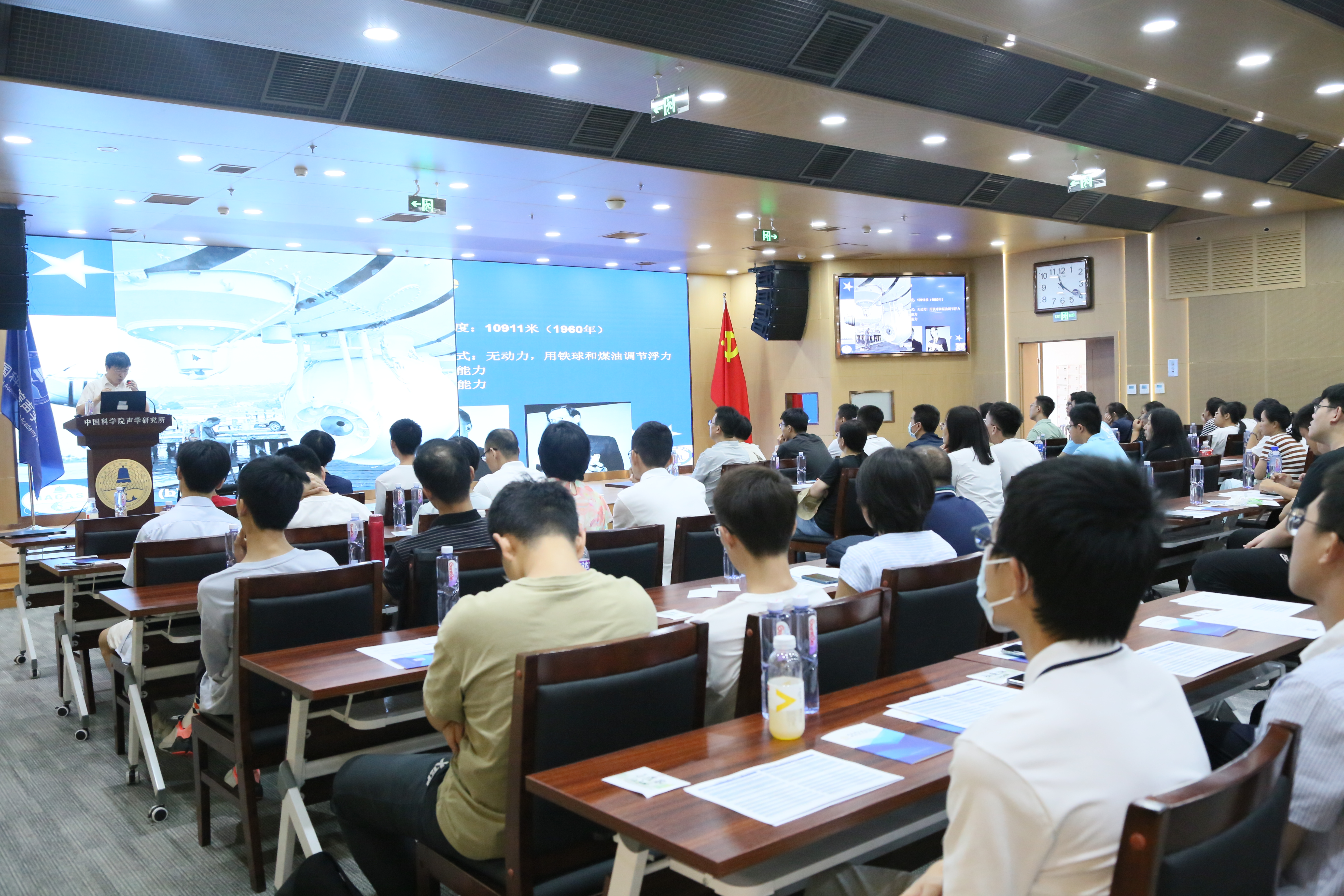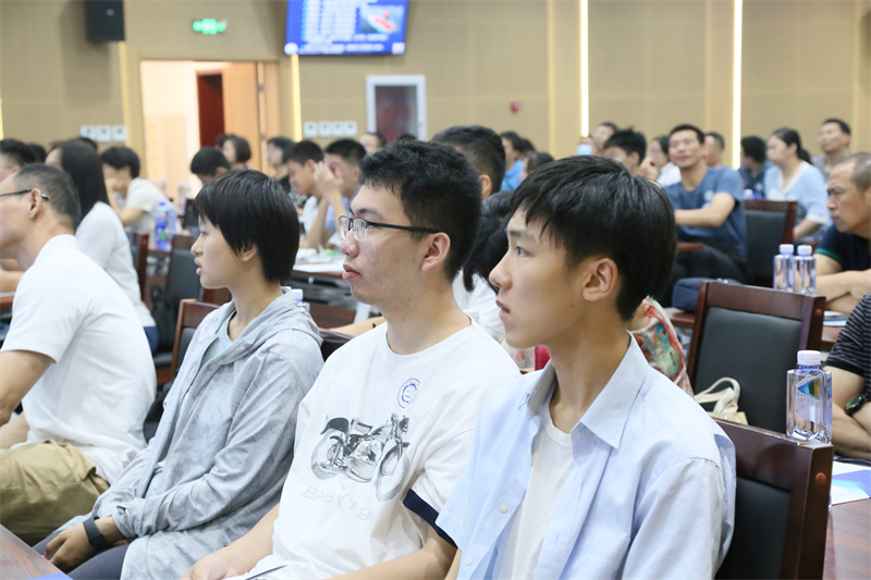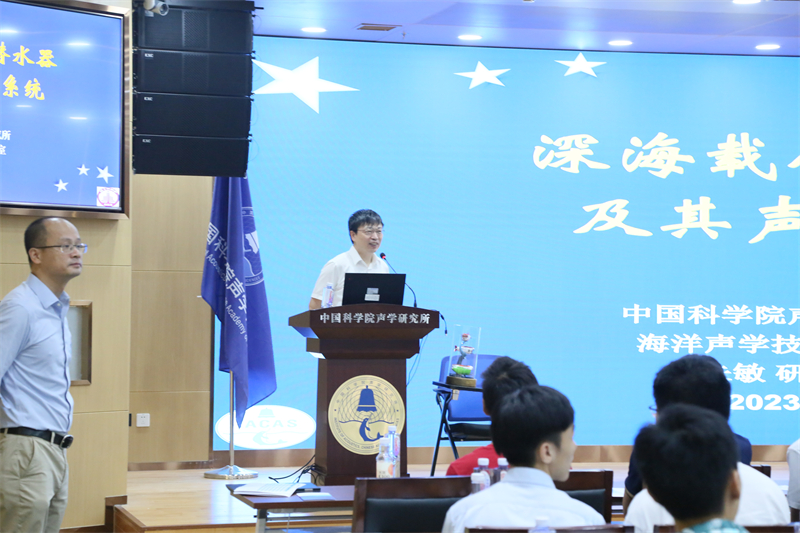 上午10:30,新生与家长一行来到声学所,简短参观展厅之后。国家科技进步一等奖获得者、全国五一劳动奖章获得者朱敏研究员(896)做海洋声呐学的科普报告。