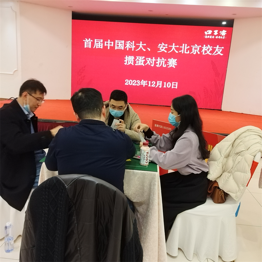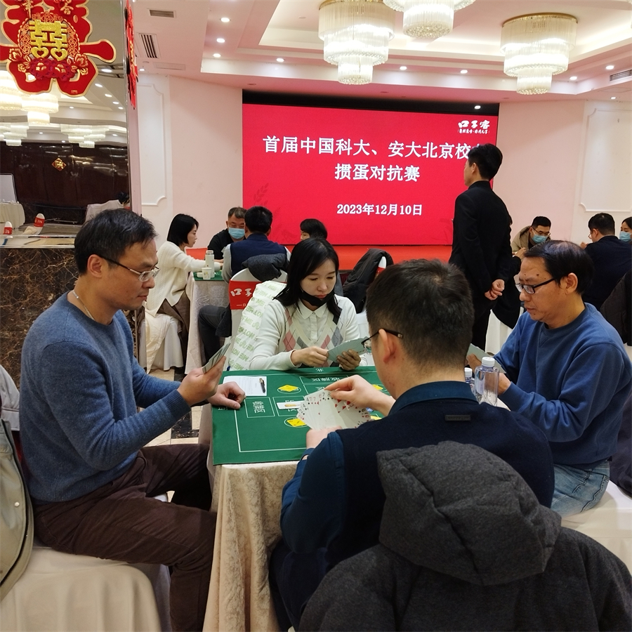 12月10日下午,首届中国科大、安大北京校友掼蛋对抗赛已在丰台区顺利进行,双方总计有近70位校友参赛。中国科大代表队15组选手出战,安徽大学代表队19组选手出战。最终,科大仅有两组选手入围前六名,分别获得亚军和季军,冠军小组来自安大。