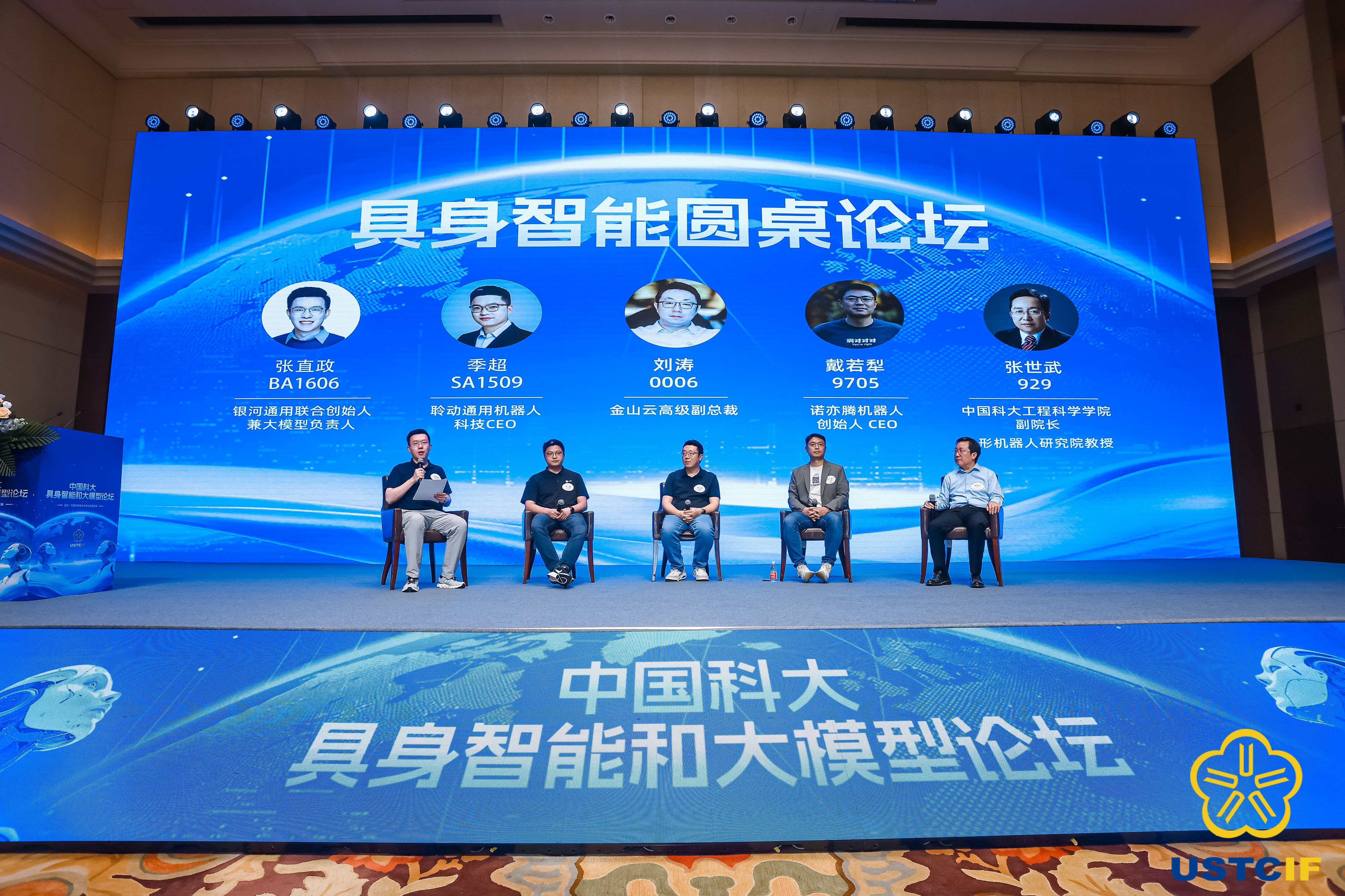 论坛设立了具身智能与大模型等两个圆桌讨论(Panel Discussion)环节。银河通用联合创始人兼大模型负责人张直政博士(BA1606)担任具身智能(机器人)Panel主持人。嘉宾为张世武(9209,中国科大工程科学学院副院长)、戴若犁(9705,诺亦腾机器人创始人、CEO)、刘涛(0006,金山云高级副总裁)、季超(1509硕,聆动通用机器人科技CEO)。