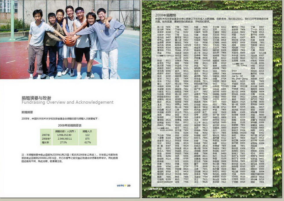 《2008年年报》中的2008年捐赠光荣榜。捐赠榜背景为二教侧楼(少年班)的青藤与北门樱花林