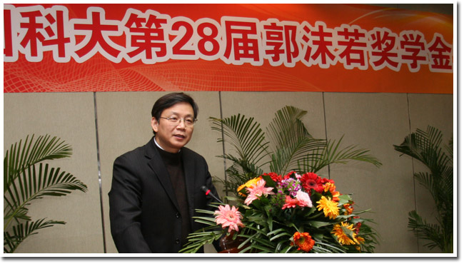 郭沫若奖学金从首次颁发至今已逾28年,侯建国表示从1980年至今,中国与世界发生了重大变化。应对金融危机,科学技术仍然是实现可持续发展的智慧之门。侯建国校长勉励获奖同学承担责任与使命,“积极进取,建功立业”。