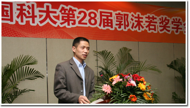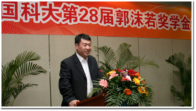 浙江杰邦投资公司副总裁何柃(8718)是现场唯一的郭沫若奖学金获奖校友。他致辞中表示“我一直以毕业于科大为骄傲。科大培养了人的独立思考能力与思维方式。这是21世纪最需要的创新型人才。我向科大致敬。” 何柃谦虚的表示“很遗憾很多比我更优秀的人没有获得郭奖;很多比我优秀的人未能来到现场。” 何柃同时坦率的忠告24位获奖同学“获得郭奖代表过去几年在特定标准下的成功。但人生的路很长,今后的标准与郭奖并不完全一样。我建议各位在走出这个(报告厅)大门的时候就忘记郭奖。”