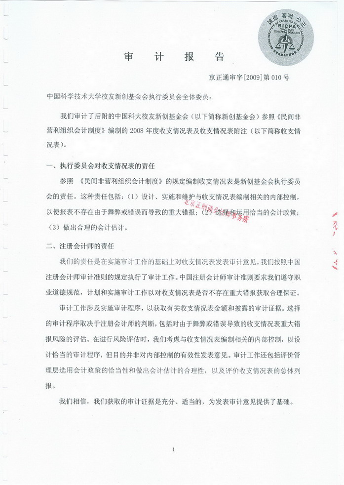 近日,北京正则通会计师事务所已将“京正通审字[2009]第010号”《审计报告》送达中国科大校友新创基金会。