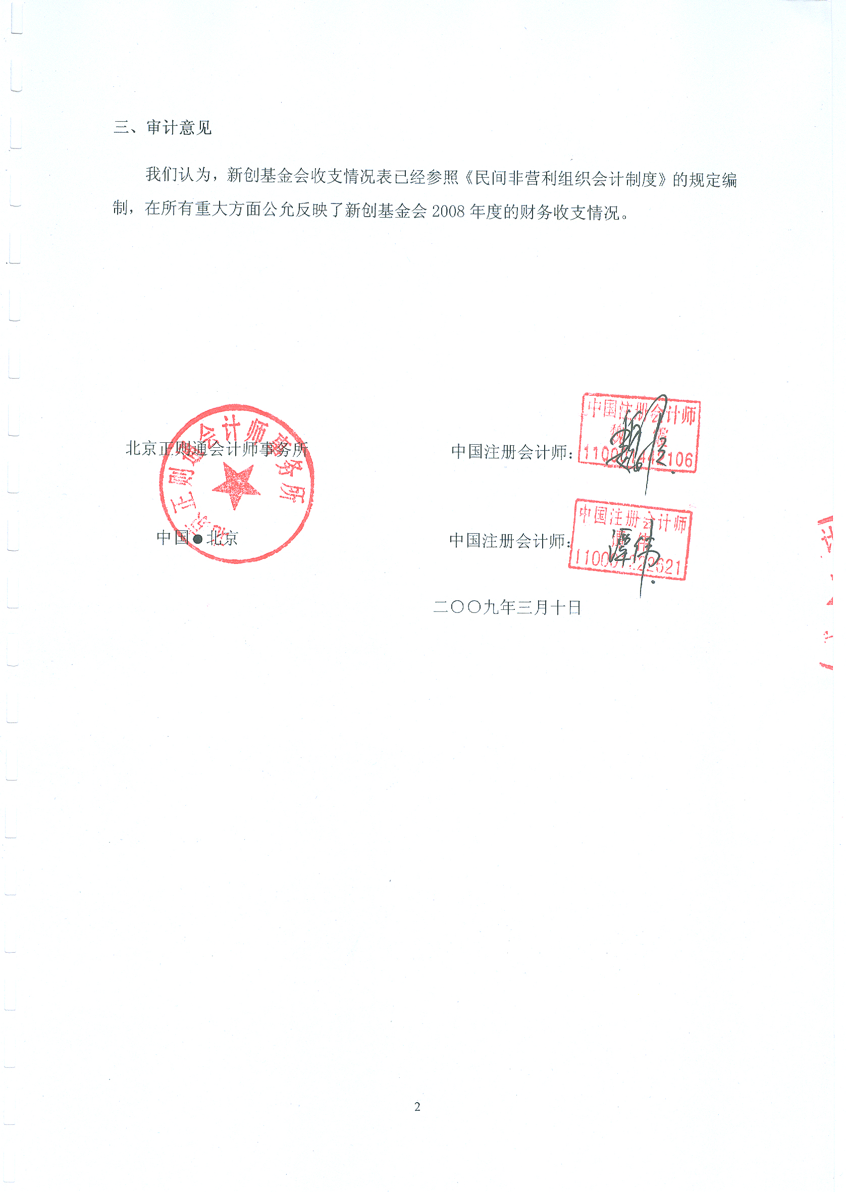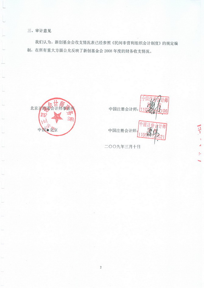 正则通会计师事务对新创基金会的2008年度财务状况进行审计后做出的审计意见为“我们认为,新创基金会收支情况表已经参照《民间非营利组织会计制度》的规定编制,在所有重大方面公允反映了新创基金会2008年度的财务收支情况。”