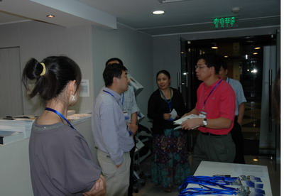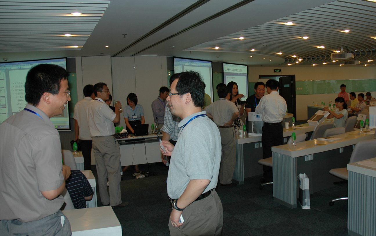 活动即将开始前:右起陈佳(801,和佳软件公司董事长,大半边脸被遮住者 )、周全(773,IDGVC)、张树新(813)、刘劲(888)。