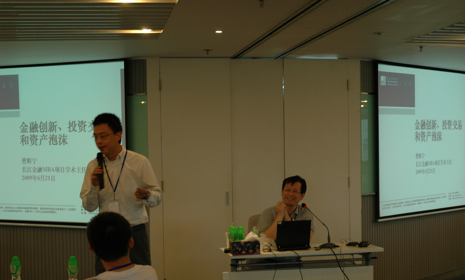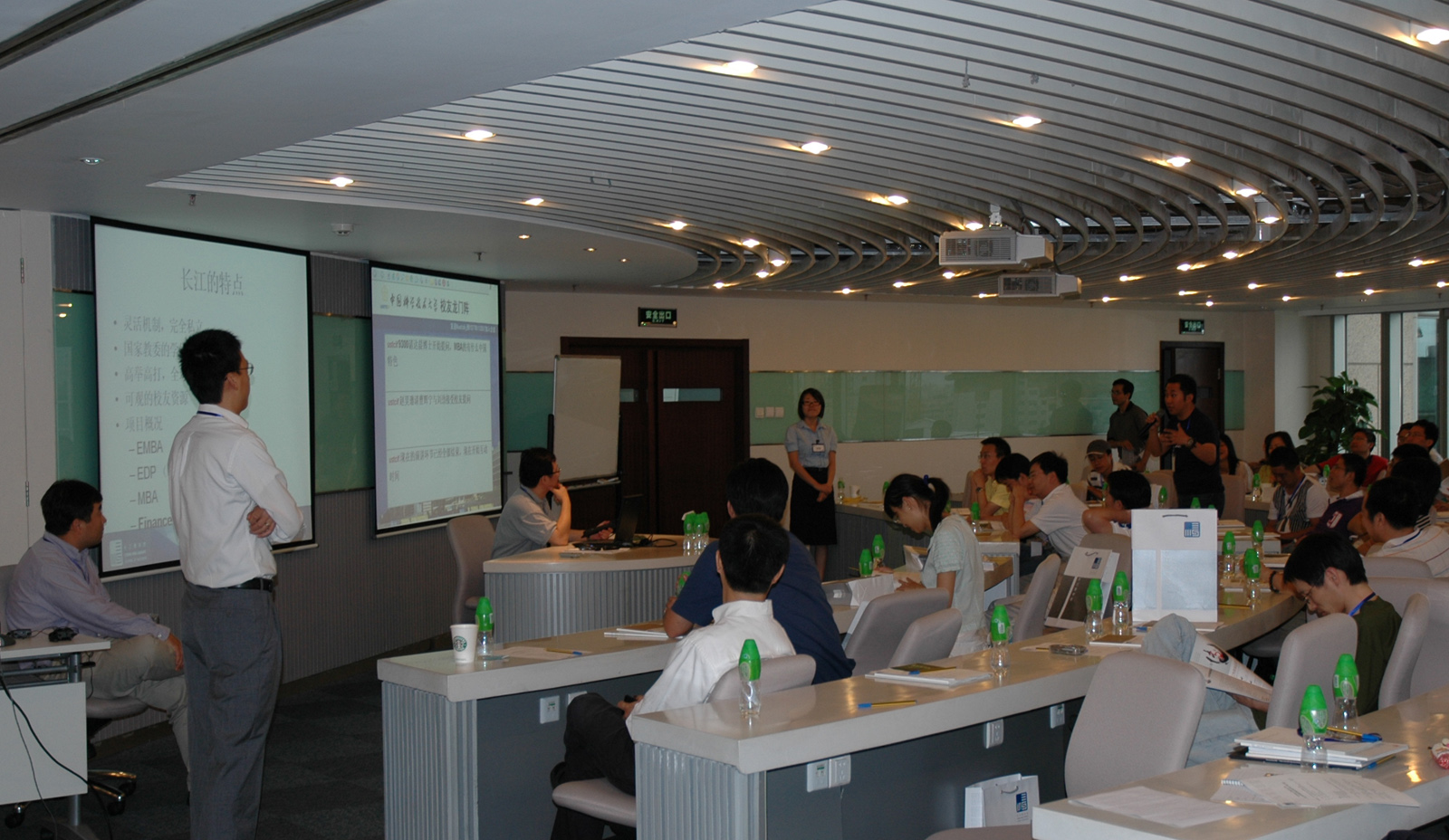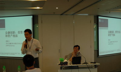 百度公司商业分析部总监诸达晨(9300、斯坦福大学博士)向曹辉宁教授提问:长江的MBA有无中国特色? 画面第一排右二黑色衣服者为87少叶一火(阿里巴巴中国雅虎口碑网负责人),长江商学院EMBA在读学员。龙门阵的前一天,他在同一间教室上课。