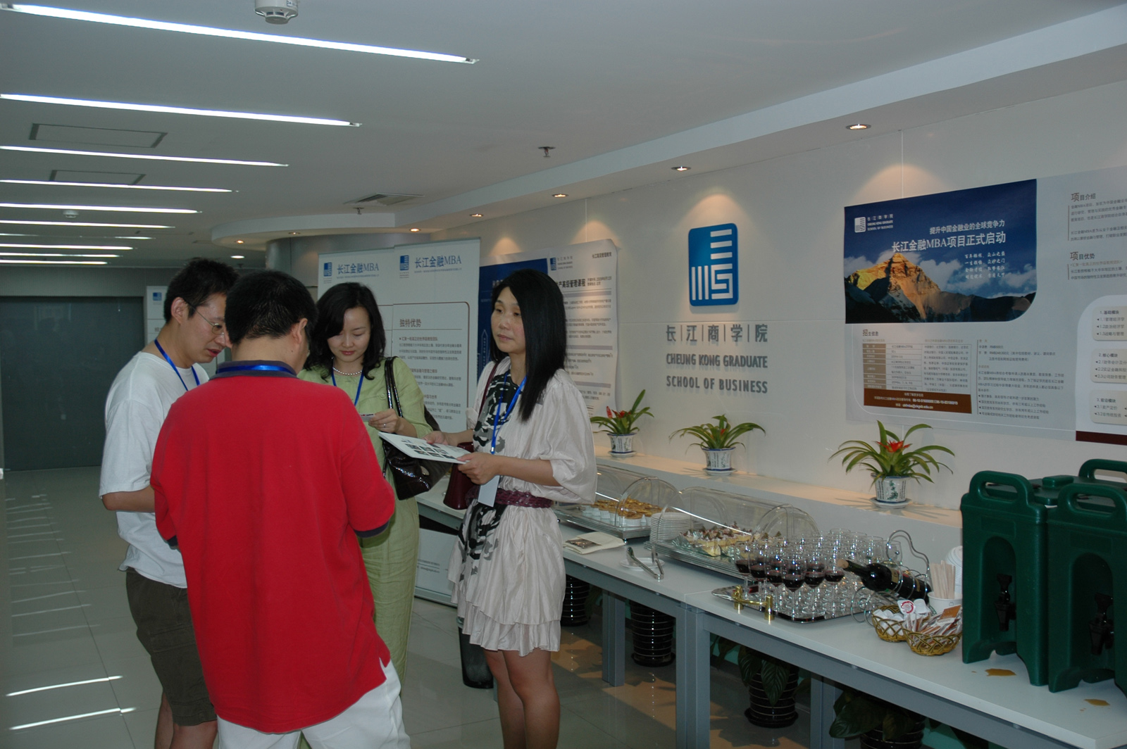 茶歇中校友交流:左起王利锋(87少,方幸星数码科技有限公司数码公司总裁 )、李林青(8715,宝洁大中华区客户生意发展部副总监)、孙晓润(8816,雀巢公司)、张健(8712,安永会计师事务所)。