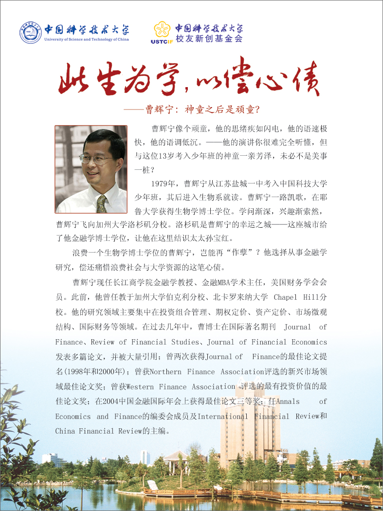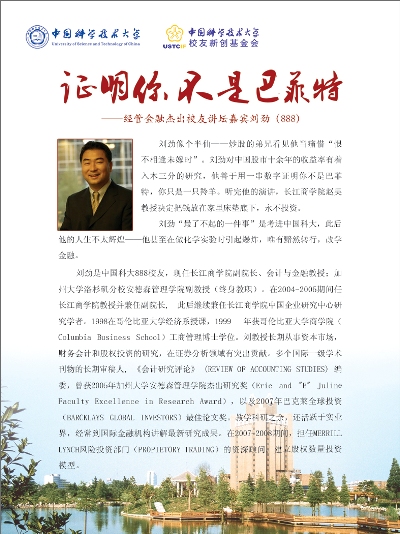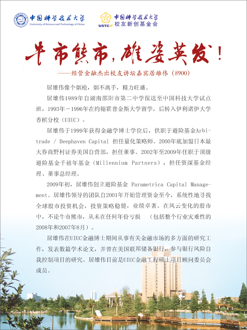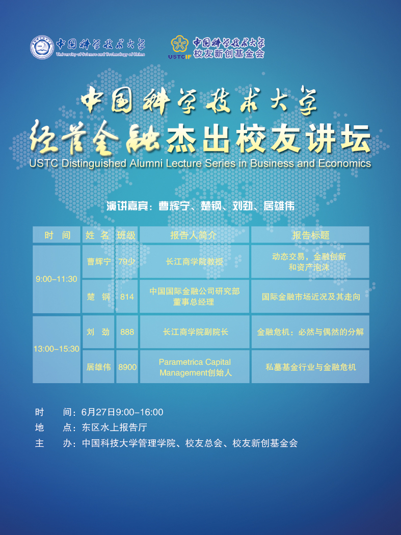 2009年6月27日,首批“中国科学技术大学经管金融杰出校友讲坛”将在中国科技大学东区水上报告厅举行。该活动议程与演讲嘉宾简介如下: