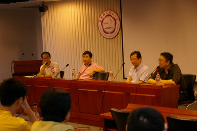 2009年6月27日晚,曹辉宁、刘劲与居雄伟等三位金融界校友来到中国科技大学东区微尺度国家实验室一楼科技展厅,与约60位同学进行一场“翻云覆雨话金融”的座谈会。