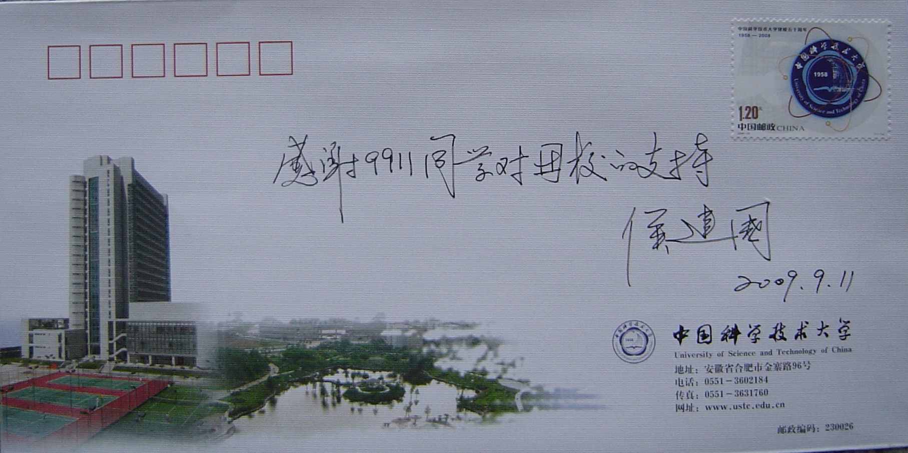 中国科技大学校长侯建国院士9月6日晚在北京得知9911即将发起对母校纪念捐赠的消息非常感动,他当即请新创基金会负责人转达对9911同学的谢意,并向9911部分校友赠送了五十周年纪念邮票的首日封,侯校长在首日封在写下“感谢9911同学对母校的支持”表达谢意。为与9911校友纪念活动保持一致,侯校长将日期签为“2009.9.11”。