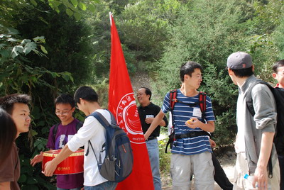 香八拉行动队出发不久,前排为三位8810校友。约5分钟后,香八拉行动队出现第一次鼓噪内讧,多位80年代校友发现”才爬不到四分之一?“,他们提出”分行李、分行李“,吃完蛋糕回家去。
