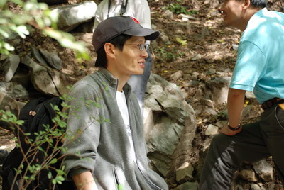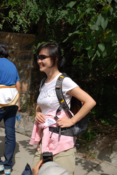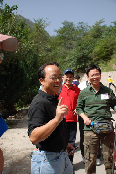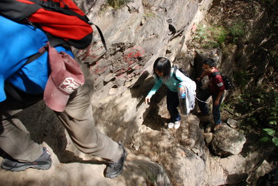 李骁军登绝壁甜蜜小憩中。李骁军警告”你们会骂名千古!谁说香八拉是残奥会项目的说?“ 出发前为校友打气,组织者忽悠校友”专业人士20分钟能上去!" 半程过后,众人骂声四起,皆乎上当。