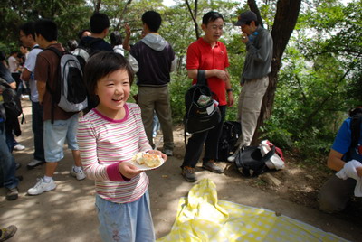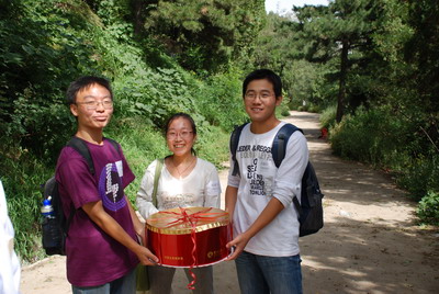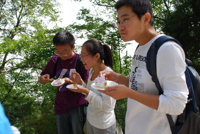 把蛋糕高举起来,插上香山的高峰!——图为贺振鑫、杨新杰与范晓轩(从左至右)三位05级校友组成的蛋糕敢死队将蛋糕顺利带上好汉坡后合影。