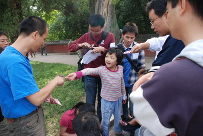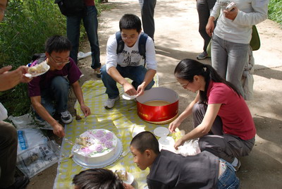 劳苦功高的05级蛋糕敢死队员们正在分发蛋糕。王以韶(图中镜头近处,玉臀高耸者)立即将脑袋伸到蛋糕边,边挖边吃。