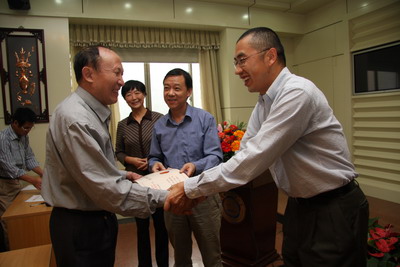 困学守望奖教金创始捐资人刘亚东向“育人终身成就奖”获奖者闫霂林教授表示祝贺。