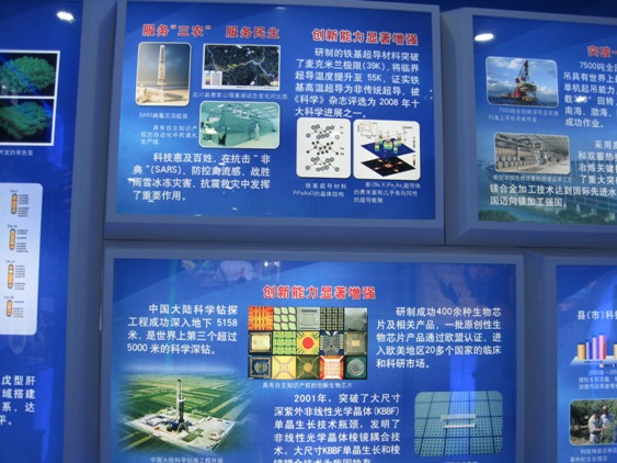 科教展厅入口处,图中左侧的玻璃柜台为中国科技大学提供的郭永怀烈士“两弹一星”勋章,图中最右下照片为中国科技大学营养餐厅。