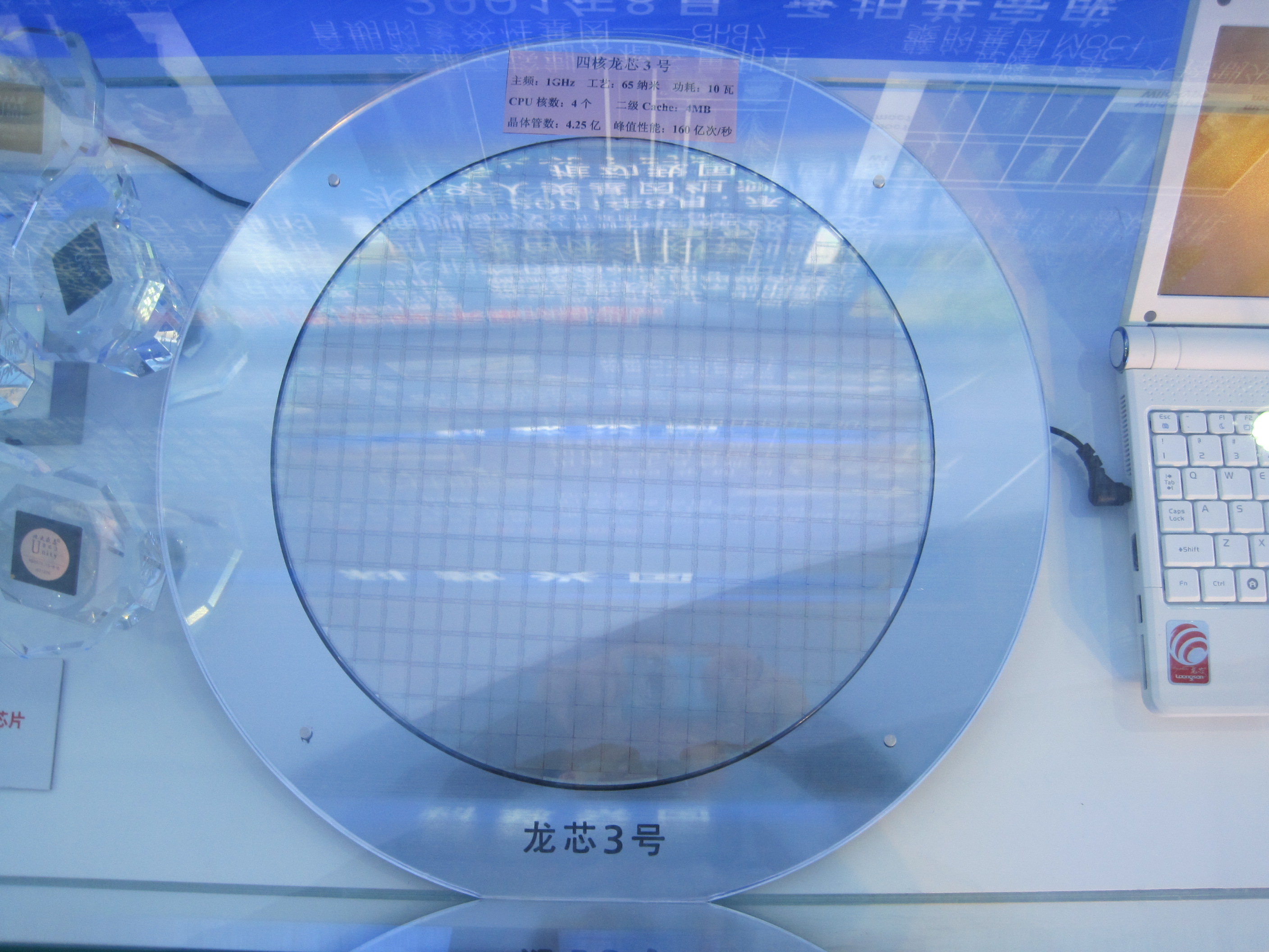 展示中国信息技术成果芯片制造技术突破的版块。图中为神州龙芯、星光中国芯并肩而立。巧合的是两种芯片首席科学家或总裁均为中国科大校友。星光中国芯负责人为中星微总裁邓中瀚(877)。