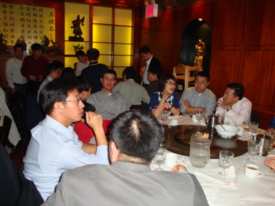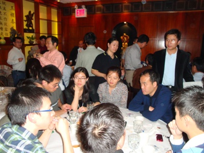 当晚纽约校友会进行晚餐。尽管场地狭小,窦贤康等人向校友们介绍了招生、人才引进、学科发展等情况。朱天华、冷晓华、倪虹、马援等金融界校友等金融界为主的40位校友出席晚餐欢迎代表团一行。