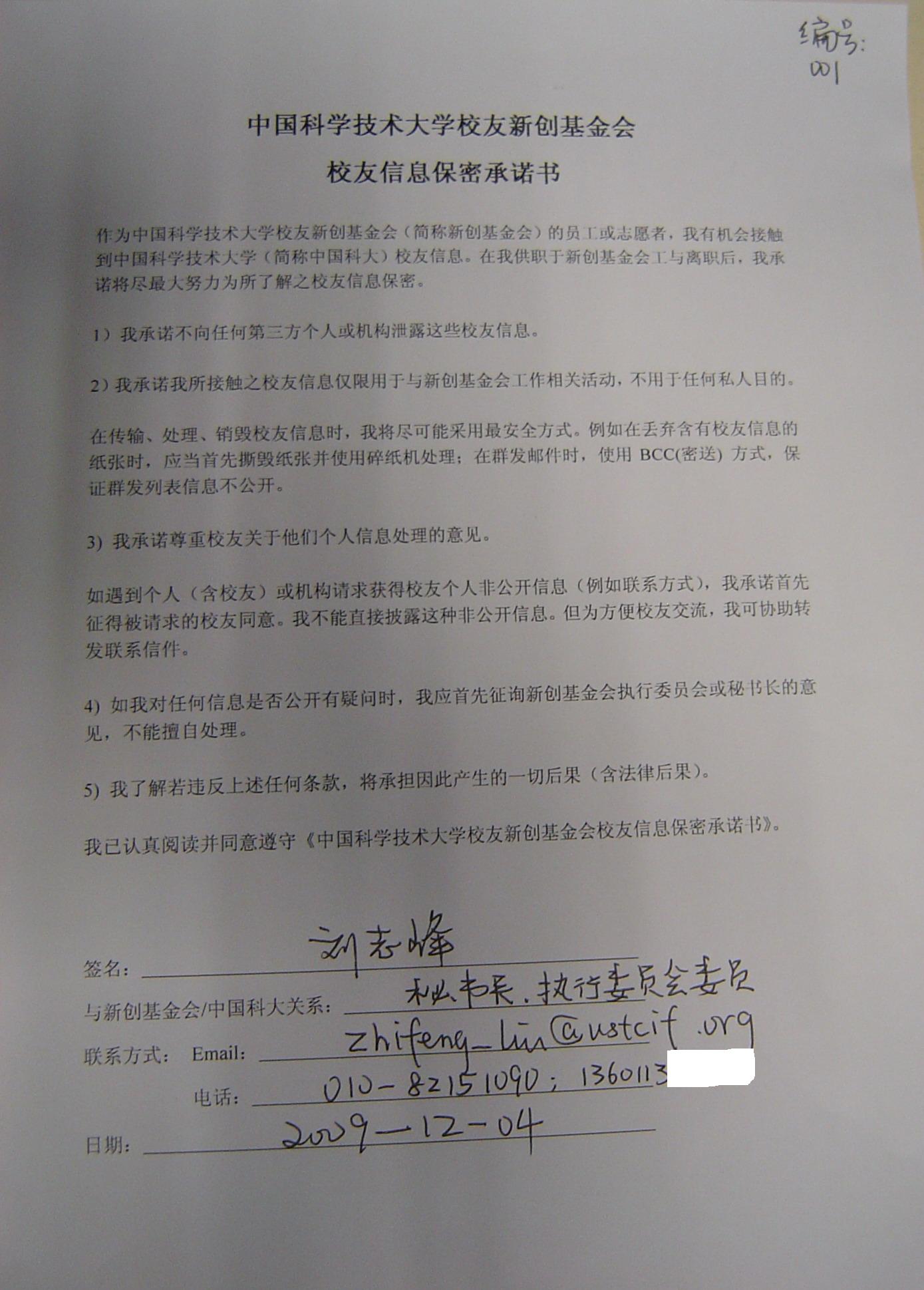 2009年12月4日,秘书处全体员工签署《校友信息保密承诺书》,以书面形式“承诺将尽最大努力为所了解之校友信息保密”,这是中国科大校友新创基金会提升校友服务质量、保护校友隐私的一步。