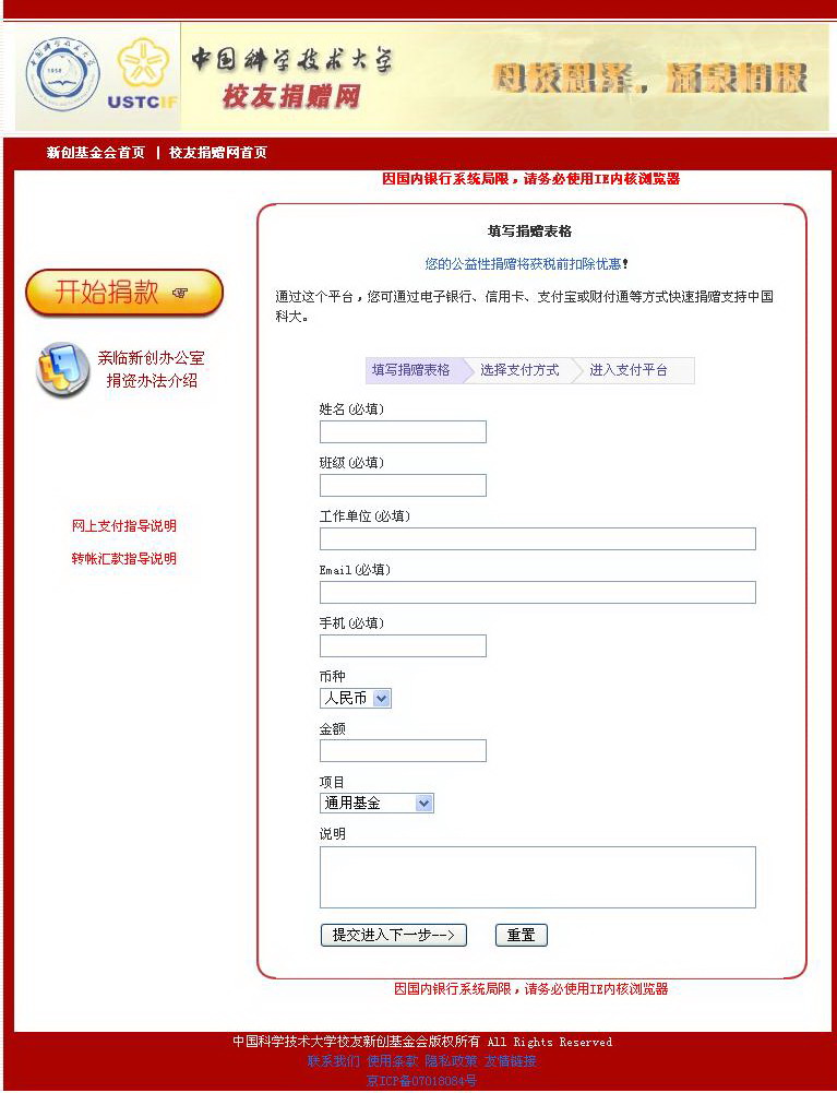 中国科大校友捐赠网演示:最方便的信用卡刷卡捐赠。