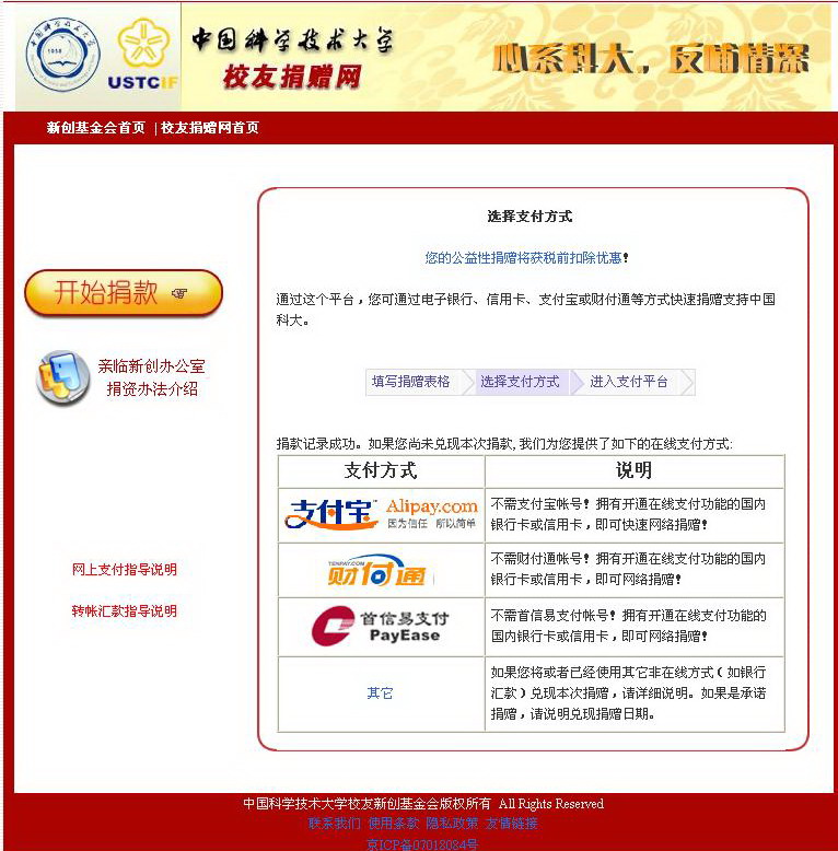 新中国科大校友捐赠网实现跨银行跨地域提供多种银行卡在线交易的网上支付服务。财付通、支付宝等多种第三方支付方式开通,将便于校友的电子银行或信用卡便利捐赠。新创基金会将在近期对页面美工设计进行完善,但功能已可正常使用。
