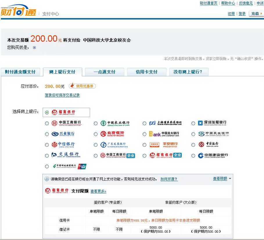 中国科大校友捐赠网演示:选择支付方式。您如果使用电子银行,可选择财付通(或支付宝)通道。即使无财付通(或支付宝)账号,也可利用电子银行转账。