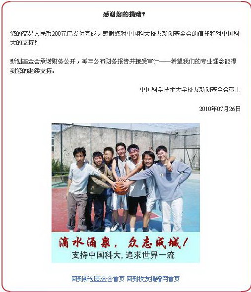 中国科大校友捐赠网演示:捐赠完成,温馨致谢。