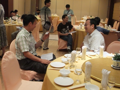 不少校友从无锡、南通、浙江杭州与宁波等外地赶来出席晚宴,包括第一批无锡“530”计划引进的创新人才、无锡辐导微电子有限公司总经理冯向光(864)、无锡创毅视讯公司总经理苏立新(844)、王跃(8712,江苏安泰安全技术有限公司)。宴会之前,隋文泉(苏州校友会副会长、苏州通创微芯公司董事长)建议冯向光作为外地校友发言,“表达来到苏州的激动心情。” 殊不知,这位本应表达激动心情的冯向光开始抱怨 “我来过苏州很多次,这次却迷路了。一看名单,我的辐导公司写成了辅导。别人还以为我是搞教育培训的呢。” 冯向光郑重声明,他毕业于近代物理系,绝不是不是贩卖教育培训资料的,从事“通讯类IC产品的设计研发”的高科技。