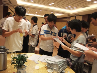 校友们在签到处,镜头右侧女孩为志愿者陆霞(0200,苏州海关)。