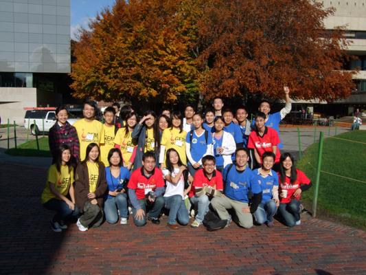 中国科大与大中华区兄弟赛队合影,白衣为中国科大队员;黄衣为香港科大队员; 红衣为台湾阳明大学;蓝衣为天津大学。