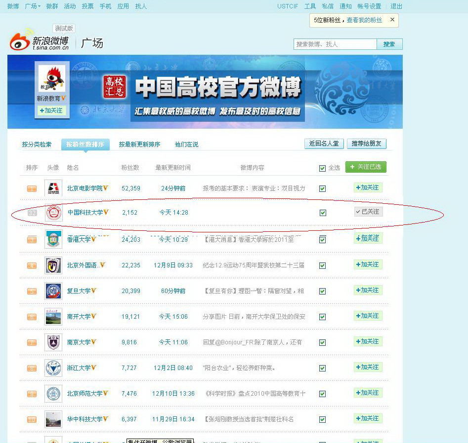 据悉,中国高校已有78家在新浪开通官方微博。截至12月12日,中国科大微博约有1957名粉丝,远逊于排名第一的北京电影学院(532324),在高校中位居37位。而复旦、南开约有2万名粉丝。清华、北大的粉丝数均不到3000人,中国科大仅有两月历史的微博看起来势头并不太差。中国科大微博开通不久,即有校友调侃“太严肃了”,新闻中心立即将新闻调整为轻松方向,并呼吁广大校友师生关注新浪微薄,这并非单纯追求粉丝数目,而是希望扩大社会对中国科大的认知程度。
