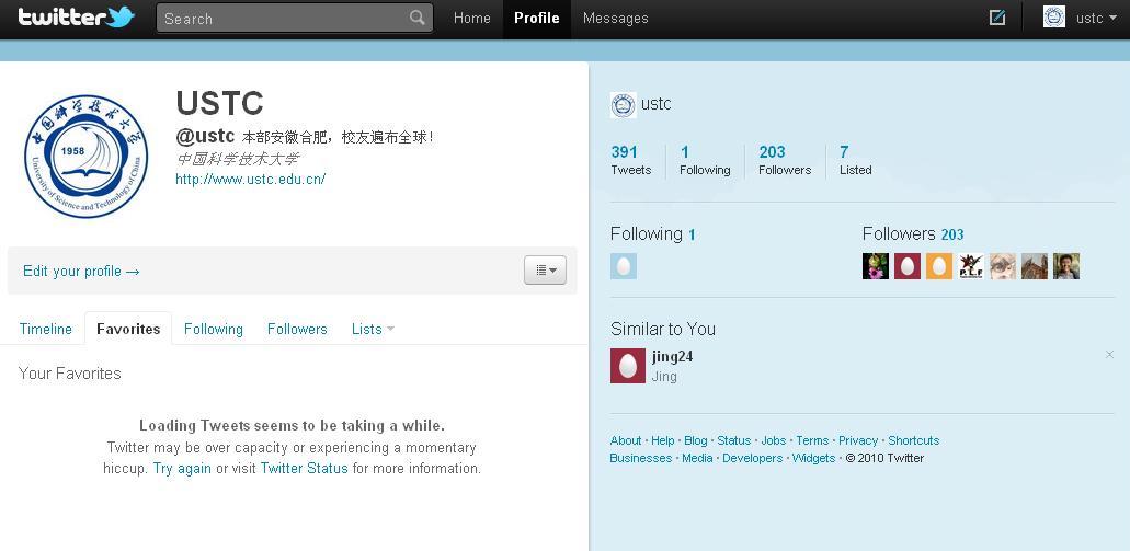 2010年10月22日,中国科大以申诉方式,夺回Twitter网站@ustc帐号,并立即开通中国科大微博Twitter。