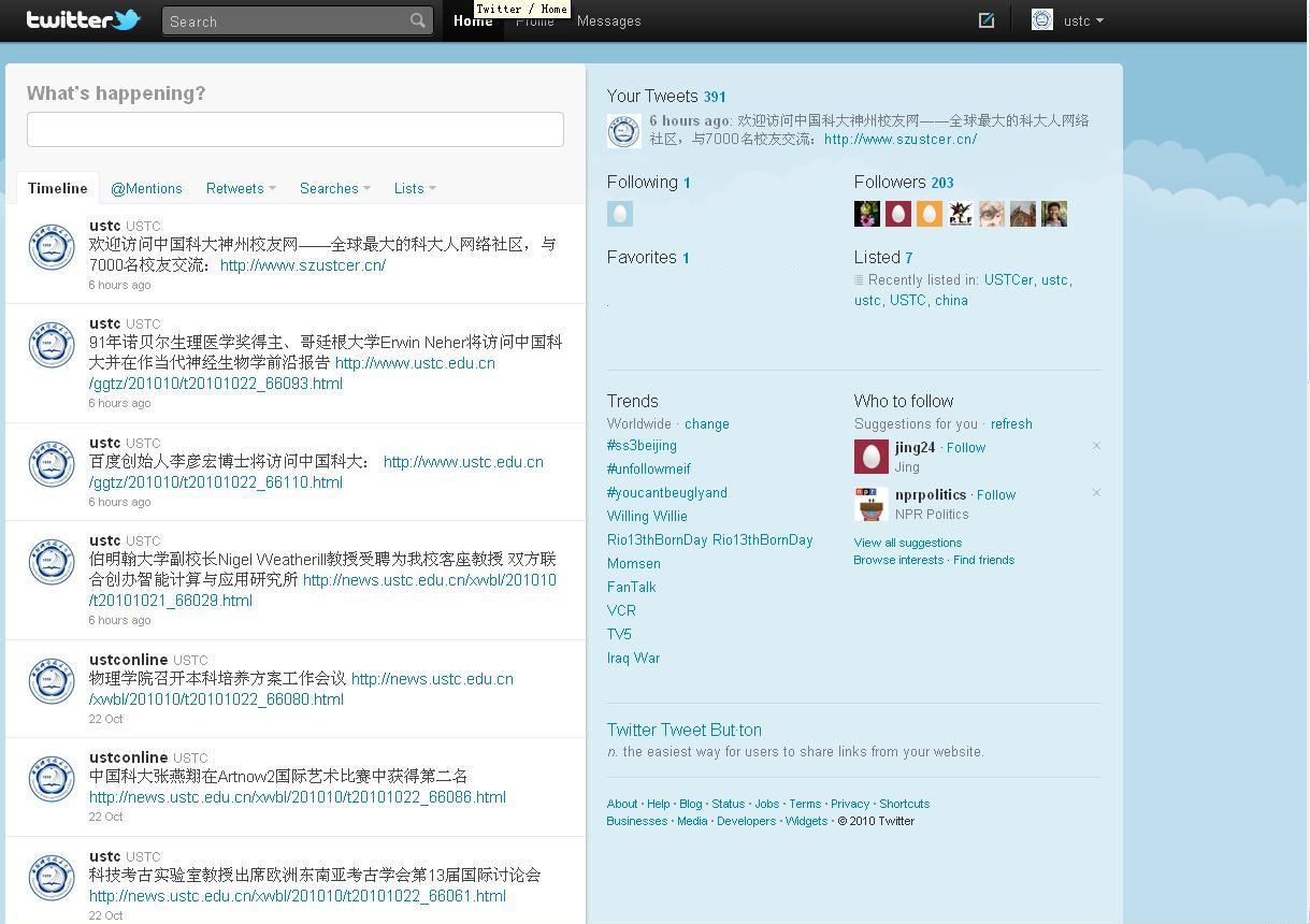 Twitter是著名微博网站,全球拥有近7000万用户,在Twitter等网站开通微博,已成为国内外知名大学的重要宣传手段。2009年,中国科大即在Twitter等开通微博(@ustconline)。遗憾的是,其时@ustc已被人抢注。