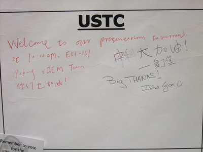 中国科大留言板上——北京大学与中国科大同学们互道加油。北京大学与中国科大是国内获得最好战绩的两支代表队。——北京大学在iGEM2010中获一金,进入总决赛位居全球第二。北京大学Best Environment Project单项奖。中国科大荣获两金一项单项奖。清华大学、浙江大学与上海交通大学、天津大学等所有大中华区,总成绩逊于北大与科大。在亚洲高校中,中国科大与北京大学也是成绩最好的代表队。