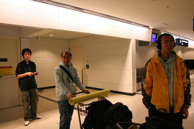 中国科大队员在芝加哥机场。图中行李车上黄色纸包装的是代表队海报。