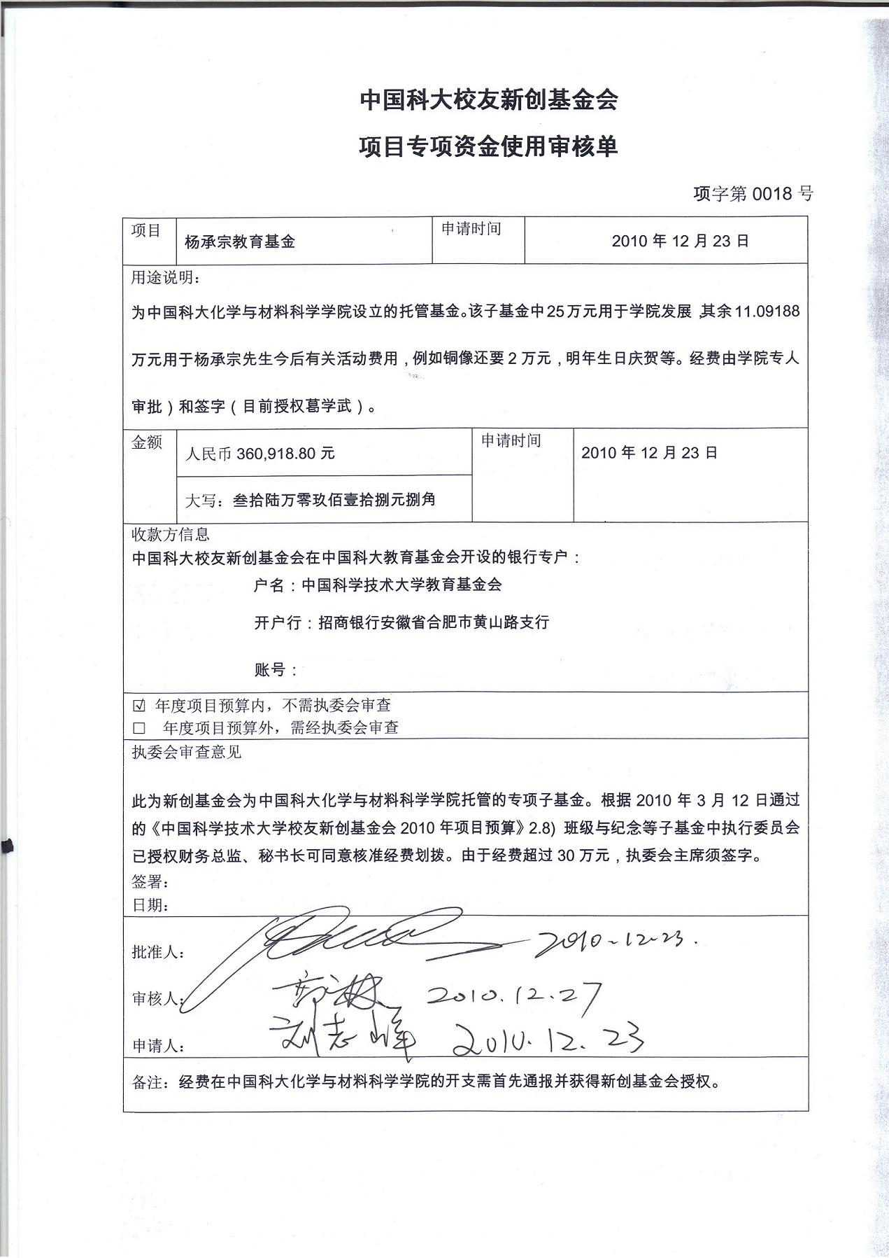 杨承宗教育基金划拨中国科大的专项经费审核单。