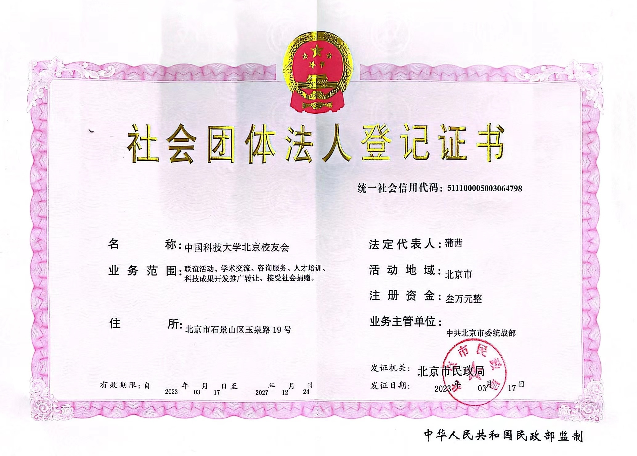 中国科技大学北京校友会(以下简称“北京校友会”)是经北京市民政局批准、北京市社会团体登记管理机构核准登记的非盈利性社会团体组织。业务主管部门为北京市委统战部。